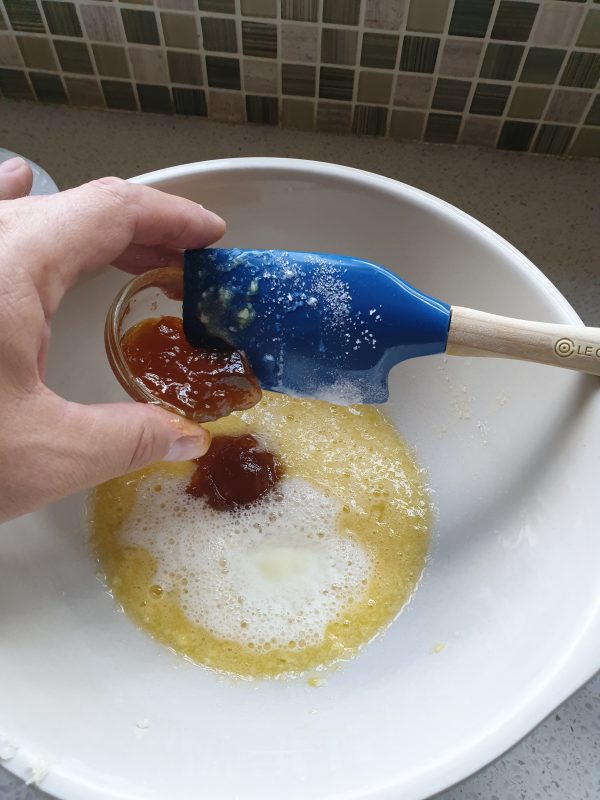 2. Add the lemon juice, baking soda and apricot jam and mix.