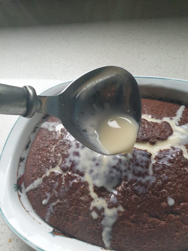 6. Pour the sauce over the hot pudding when it comes out of the oven.